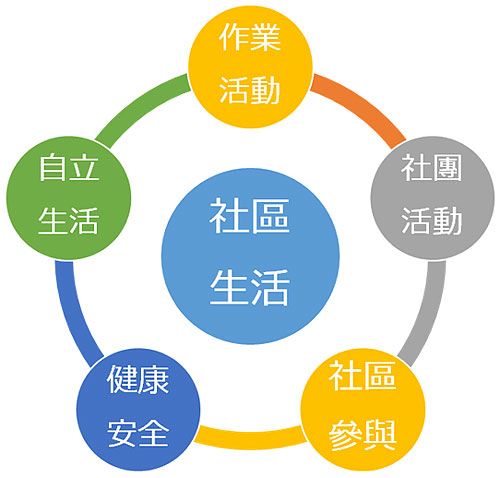 日常透過「作業活動」、「社區參與」、「居家生活」、「體能活動」及「休閒活動」達到支持身心障礙者「自我照顧」、「人際互動」及「自立生活」等目標。